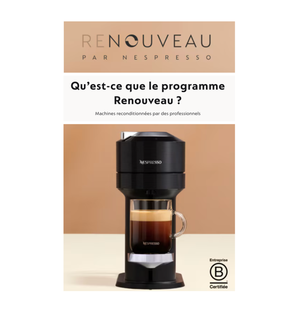 Renouveau (ReLove internationally) is Nespresso’s reconditioning program in Canada. The company sells second-hand coffee machines that have been repaired, cleaned, and tested to offer the same level of quality as a new machine. It’s an eco-friendly and economical solution that doesn’t compromise on what makes Nespresso so great: taste and design.
